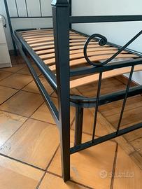 Struttura letto singolo in ferro lavorato più rete a doghe. Misure rete cm: h88, l194 , p 89 adatto a materasso singolo standard. Misure struttura cm: h testata 117, h da terra, l203, p93. Eventualmente disponibile materasso in gommapiuma.