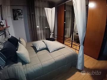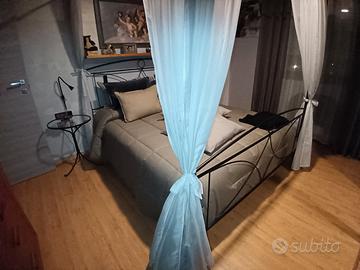Struttura letto matrimoniale a baldacchino in ferro battuto compreso di tendaggio, rete e comodini con piano in vetro.