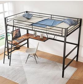 Moimhear Struttura del letto in metallo 90 x 200 cm, Letto in ferro, Letto a soppalco con scrivania a forma di L e ripiano per bambini, adolescenti e adulti (Nero)
