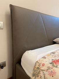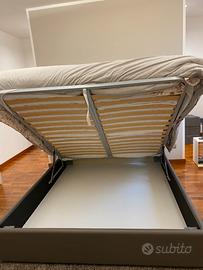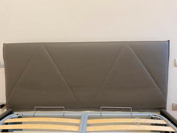 Struttura letto matrimoniale con contenitore e doghe in legno. Lunghezza 190 cm, largezza 160 cm (per materassi da 80 cm), testiera letto lunghezza 177 cm in ecopelle leggermente usurata lato sinistro.