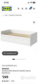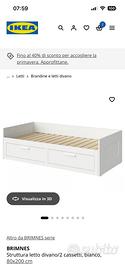 Vendesi struttura letto (no materassi) divano con 2 cassetti. All’occorrenza diventa un letto matrimoniale 80x200 aperto 160x200, modello Brimnes, acquistato da Ikea il tutto in buone condizioni. Solo ritiro a mano a carico dell’acquirente zona Quartu Sant’Elena.