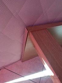 struttura letto matrimoniale in legno spazio interno cm 162 larghezza..e lunghezza 201 ...più 22 cm dei bordi laterali tot larghezza max 184 e lunghezza massima con i bordi e la testata 217 cm.2 comodini larghezza 45.5 profondità 42.5 altezza 44. 1 comodino bordi un po' rovinati come da foto e un bordo del letto scollato come da foto da rincollare .