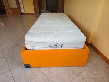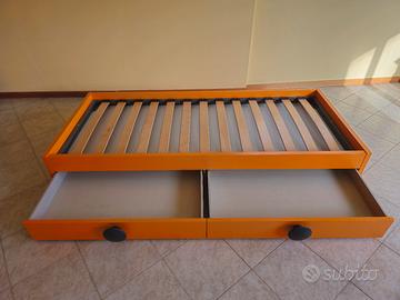 Struttura letto in legno massiccio della NIDI camerette, con ruote per lo spostamento e due cassettoni, completa di rete a doghe ortopediche con misura 80 X 190. (il materasso in foto non è compreso)
