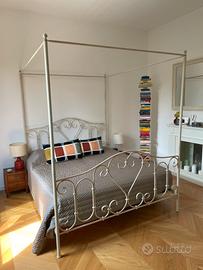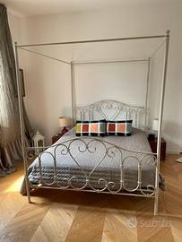 Struttura letto shabby chic in acciaio, configurabile bassa o a baldacchino, color panna anticato, ottime condizioni. Visibile di persona a Pavia. Ingombri per trasporto testata cm 125x170 circa, raccordi longitudinali 200cm