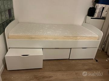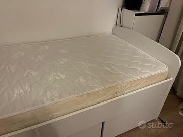 Struttura letto singolo alta Ikea; ,2 contenitori bianco, in perfette condizioni. Misure 120x200. Compreso di materasso.