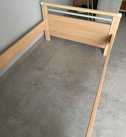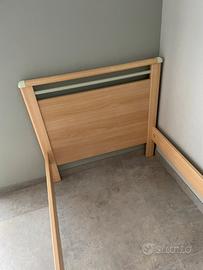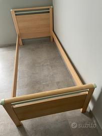 Struttura letto singolo il legno chiaro con inserti verde germoglio. Cm 90x200, altezza testiera cm 83. Presenta qualche segno di usura. No spedizione