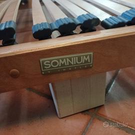 Struttura con doghe per letto stile giapponese di marca Somnium di Imaflex. Acquistato a fine anni '90 in negozio arredamento di lusso. Smontato causa trasloco, si compone a incastro . Compreso di comodino basso.