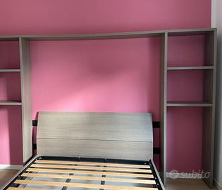 Struttura a ponte in legno scuro da mettere nella parete dietro al letto e utilizzzabile anche come libreria. Con spazi per inserire eventuali comodini.