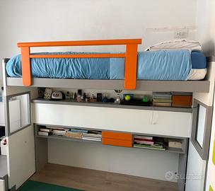 Struttura letto singolo con letto alto e possibilità di inserirne un secondo (non disponibile) nella partr sottostante. La struttura è mobile. Si tira in avanti per consentire la salita attraverso scalette (con cassetti) e camminamento laterale su mobile contenitore. Il letto è quindi riaccostabile
