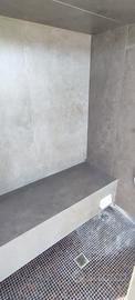 • Doccia centrale con soffione a pioggia, doccetta manuale, comandi a parete e panca integrata. Pareti in finitura scura, pavimento con mosaico e scarico centrale.