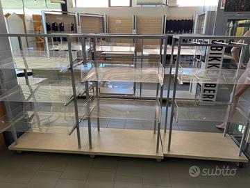 Vendesi, anche singolarmente a €99,00 l'uno, mobili con rotelle con base in legno e con mensole in plexiglass e supporti in metallo.