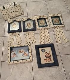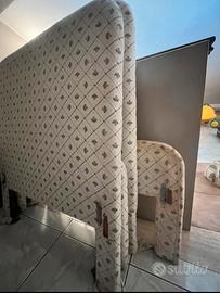 Strutture letti singoli :2 testate e 2 pediere rivestite in tessuto shabby 6 quadretti con lo stesso rivestimento 2 baldacchini per le tende con stesso rivestimento