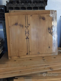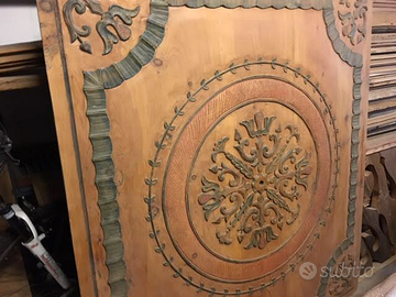 E' in abete con intarsi di noce e il rosone centrale scolpito a mano è in legno di cirmolo.