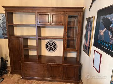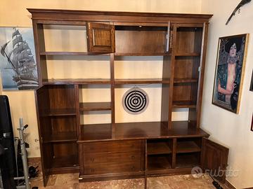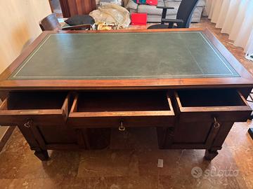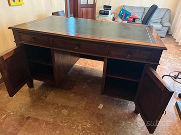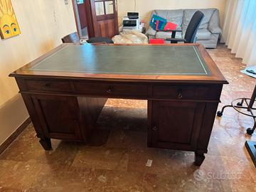 Studio Completo di Prestigio in Legno – Scrivania + Libreria a Parete Eleganza, solidità e fascino senza tempo per il tuo ufficio o angolo smart working. Vendesi splendido coordinato da studio in ottime condizioni, ideale per professionisti o per chi desidera un ambiente di lavoro raffinato e funzionale in casa. Il set è realizzato in legno con finitura calda, arricchito da dettagli classici e finiture artigianali. Il set include: - Scrivania con ampio piano di lavoro ed inserto in vera pelle verde scuro (perfetto per dare un tocco di classe).Dotata di numerosi cassetti e vani portaoggetti con chiusura a chiave originale. Pannellatura frontale rifinita. - Grande Libreria a Parete Multifunzionale conStruttura a ponte e scaffalature a giorno per libri e faldoni.Vetrinetta per esporre oggetti di valore. Base con ampi cassetti e sportelli chiusi per archivio riservato. Stato del mobile: Ottime condizioni. Il legno presenta la normale patina del tempo che ne autentica il valore. Nota: Il contenuto della libreria e gli oggetti sulla scrivania non sono inclusi. Dimensioni: - libreria[profondita’60x lunghezza230x altezza 220] - scrivania ( larghezza 90x lunghezza 150) Smontaggio e Trasporto: A carico dell’acquirente (disponibile per visione di persona) #arredamentostudio #scrivaniadirezionale #libreriaclassica #ufficioprestigio #legnomassello #smartworking #studioprofessionale #mobiliantichi #interiordesign #occasioneufficio #scrivaniaantica #arredocasa