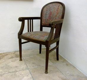 •Struttura in legno con braccioli torniti e seduta imbottita rivestita in tessuto d’epoca.