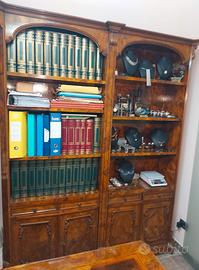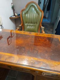 studio completo di tavolo e libreria con poltrone classico ed elegante tutto completamente in radica adatto per attività professionale misure tavolo con 8 cassetti ai lati e 3 centrali 140x70 cm mentre libreria 35x160 cm. Prodotto artigianale
