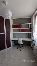 Mobile studio con libreria, cabina armadio angolare e piano scrivania in laccato goffrato con struttura in alluminio satinato e pannelli in metacrilato semitrasparente colore amaranto.