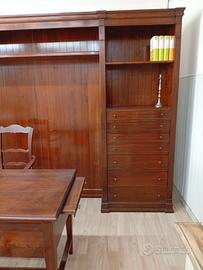 Prezzo realizzo,noce canaletto ,legno massello artigianale,ottimo per studi importanti ,composto da mobile con boiserie centrale,vetrina laterale con vetri molati,cassettiera laterale,scrivania con cassetti,sedia con braccioli,e 2 sedie piani legno , ancora montata per visionare. possibilità di trasporto e montaggio.