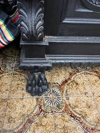 Tavolo scrittoio con due cassetti e libreria tre ante in stile rinascimentale con intagli floreali e zampe a zampa di leone. Da restaurare