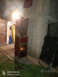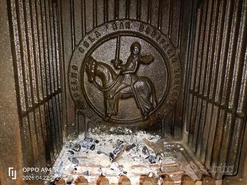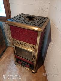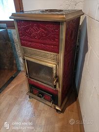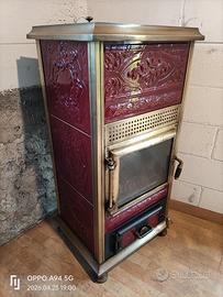 Stufa a legna, stile vintage/ Liberty della Anselmo cola, riportata a nuovo, usata solo una volta come prova. Disponibile foto e video del funzionamento. Ampio focolare in ghisa, doppio giro fumi interno, tutto in ghisa di ottima fattura, rivestimento in maiolica stile liberty. Due maioliche, prima crepate, sono state riparate con una tecnica usata per riparare le olle delle antiche stube austriache o i refrattari, con un ispirazione dello stile giapponese wabi-sabi (graffettate e riempito le fughe in gesso e brillantini argentati per metterle in risalto e valorizzare le crepe vedi ultima foto). Su richiesta possibilità di consegna con furgone, no spedizione perché questo tipo di stufa non è possibile stenderla su bancale Misure 60*60cm H100cm Uscita dei fumi da 100mm Circa 8kW di potenza