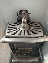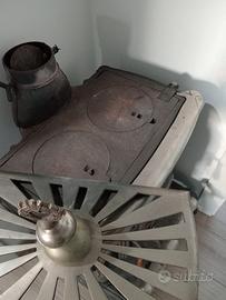Vendo stufa a legna antica appartenuta a mio nonno. Realizzata in ghisa decorata con dettagli in ottone e maniglia in legno. Ideale come elemento d’arredo vintage o da restaurare.