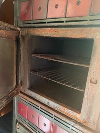 stufa a legna rossa con forno con ruote, funzionante ,piccolo difetto all'interno un pannello si e' staccato ma funziona basta cambiare nel caso quel pannello