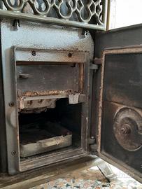 Stufa a legna marca Foco (La Nordica), modello Dorella in ghisa smaltata con refrattari, perfettamente funzionante. Anelli concentrici rimovibili per cucinare a diretto contatto col fuoco (come una cucina economica, o potagè) e griglia di protezione a discesa; sportello inferiore per ventilazione, accensione, alimentazione, cassetto rimozione ceneri ecc.