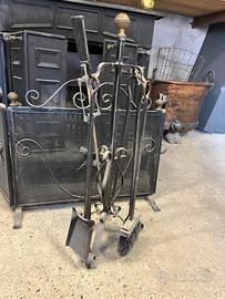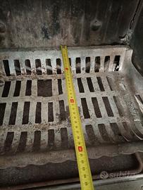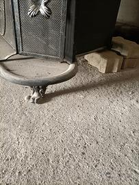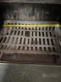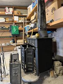 Stufa a legna in ghisa completa di accessori, parascintille e canna fumaria, perfettamente funzionante. Le misure sono: larghezza 95, lunghezza 65 compresa pedana frontale, altezza 100.