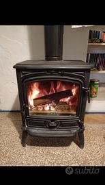 bellissima stufa a legna interamente in ghisa smaltata in ottime condizioni, cassetto raccoglicenere, apertura frontale e laterale, scarico fumi diam. 140 e ampio vetro sul focolare