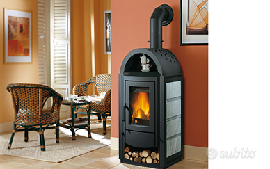 Vendo stufa a legna La Nordica Svezia New da 9 kW, struttura in ghisa con vetro ceramico e vano porta legna inferiore.