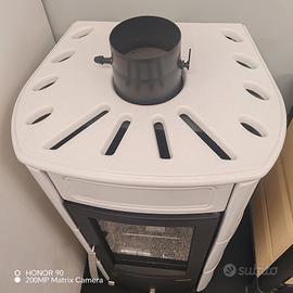 Stufa a legna Palazzetti modello Elisa 11kw, rivestimento in ceramica colore bianco puntinato, ampio vetro ceramico per una suggestiva visione della fiamma, interno focolare in magnofix che ottimizza l'irraggiamento, base camera di combustione in ghisa, cassetto cenere ampio, uscita per canna fumaria superiore d.150, tronchetto con valvola per regolazione fumi, certificata 4 stelle.