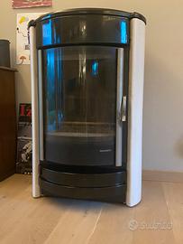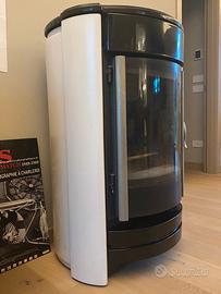 Moderna stufa realizzata interamente in maiolica. Il focolare in ghisa ad alto spessore è dotato del sistema della doppia combustione.Uscita fumi reversibile posteriore e superiore.