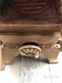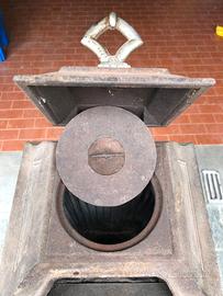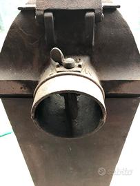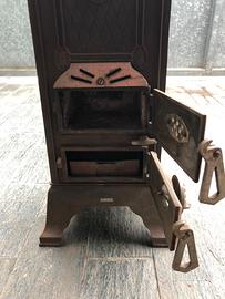 Stufa a legna, pregevole esempio di antiquariato industriale, risalente ai primi del Novecento. Ecco alcuni dettagli basati sulla tua immagine: Materiale: È realizzata interamente in ghisa, un materiale eccellente per accumulare e rilasciare calore in modo graduale. Design: Presenta un'estetica tipica dell'epoca con ricchi fregi decorativi, tra cui un medaglione centrale a rilievo e piedini lavorati. La struttura è verticale e stretta, simile ai modelli "a colonna" o "parlor stove" (da salotto) diffusi tra la fine dell'Ottocento e l'inizio del Novecento. Funzionalità: La parte superiore con maniglia serviva probabilmente per il caricamento del combustibile, mentre gli sportelli inferiori consentivano la regolazione dell'aria e lo svuotamento della cenere Dimensioni : 1100mm x 300mm x 300mm