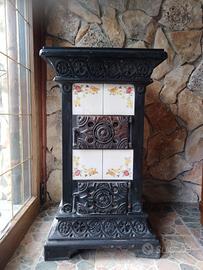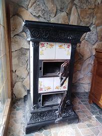 Stufa a legna in ghisa decorata in ceramica.