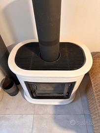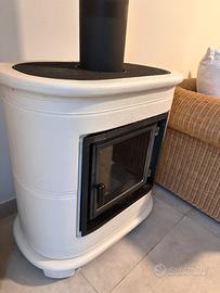 Elegante Stufa a legna con rivestimento completo in Maiolica lavorata a mano, marchio Piazzetta, modello E 905.