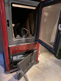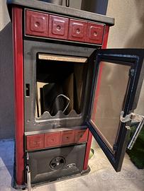 Vendo stufa a legna Royal, struttura in ghisa pesante, rivestimento rosso in maiolica e piastre frontali in ceramica.