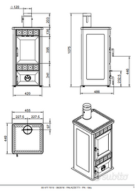 Stufa a legna tradizionale con fianchi in acciaio smaltato, piastrelline in ceramica sul frontale e top in ghisa. Il focolare è in refrattario e vanta un ampio cassetto cenere con sistema di scuoti griglia. La porta del focolare è in ghisa con vetro ceramico ed è dotata di un sistema di autopulizia che garantisce una più lunga e limpida visione del fuoco.