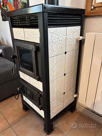 Stufa a legna rivestita in piastrelle di ceramica bianca Dimensioni: cm 50 x 50 x altezza 110 Con vetro anteriore nuovo In ottime condizioni Ritiro a domicilio
