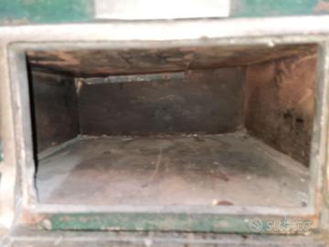 Cucina a legna, corpo in ghisa e lamiera smaltata; piastra superiore in ghisa con dischi concentrici estraibili.