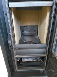 Rivestimento esterno in acciaio porcellanato, focolare in refrattario, porta, telaio, basamento e testata in ghisa - cassetto cenere estraibile - aria primaria e secondaria regolabile per migliore gestione combustione, sistema di post-combustione per basse emissioni, vetro ceramico, scuotigriglia - lunghezza max legna 22 cm