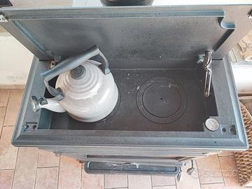 Stufa usata per questa stagione. Potenza nominale 12.2 kw. Classe 5 stelle secondo emissioni. Ha un fornello piccolo per cucinare.