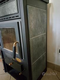 Stufa a legna con corpo in acciaio, porta e supporto in ghisa con vetro, fianchi in pietra serpentino, camera di combustione in ghisa con pareti rimovibili.