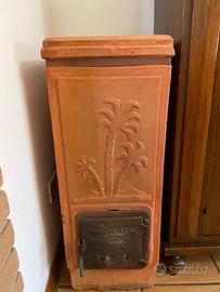 Stufa a legna in terra cotta con decorazione palme a rilievo sportello in ghisa funzionante, misura altezza 82, profondità 42, larghezza 31