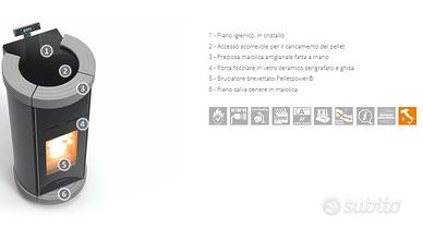 Prodotto verificato per almeno 1 ora dalla casa madre, No tarature o collaudi,Pulizia semplificata Thermocore® Scambiatore a fascio tubiero, Basso consumo elettrico, Grande accumulo termico, Pelletpower® Bruciatore brevettato Smart info, Mechanical safety-devices, Made in Italy