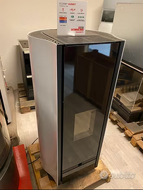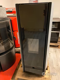 Stufa a pellet dalle forme moderne con rivestimento in acciaio e frontale in vetro, portina con doppio vetro e sistema dii auto pulizia;