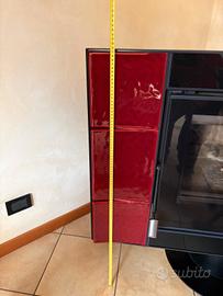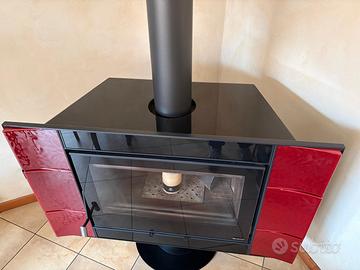stufa girevole Nordica a legna come nuova, rivestimento intercambiabile in maiolica rossa o legno, completa di canna fumaria come da foto.