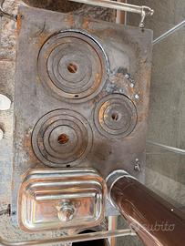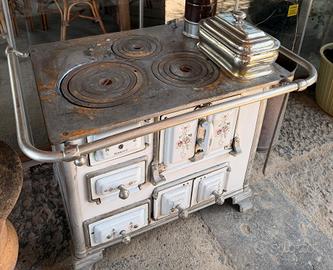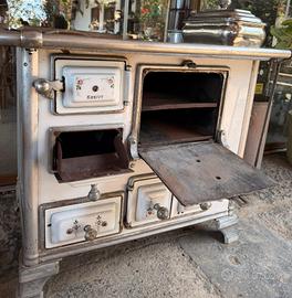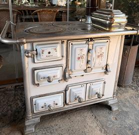 Questa è una stufa/cucina a legna antica, spesso definita "cucina economica", della marca Krefft, risalente probabilmente all'inizio del 1900. Struttura con finiture in ghisa e sportelli con inserti in porcellana smaltata. Pannelli di porcellana bianca Dipinte con motivi floreali. Dotata di diversi sportelli per il focolare, il forno e la pulizia della cenere, ed una piastra superiore per la cottura, con caldaia bonificata in rame. Perfettamente funzionante. Completamente restaurata e pezzi originali. Un pezzo Vintage imperdibile per gli appassionati!!!