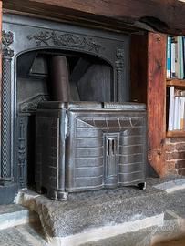 Si tratta di una stufa economica vintage in ghisa, stile Art Deco o Liberty, da inserire nel camino.