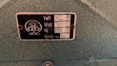 Marca: “db” (produzione italiana, probabilmente Nord Italia) Alimentazione: 125V / 1000W – tensione pre-riforma (ante 1960) N° seriale: 662 Scocca interamente in acciaio stampato con finitura a martellatura verde militare (hammertone coating), tipica della produzione industriale italiana del dopoguerra. Griglia frontale in fusione di ghisa/ferro, piedini originali in gomma vulcanizzata, maniglie laterali a molle elicoidali con supporti in alluminio pressofuso, interruttore in bachelite nera originale. Elemento riscaldante a resistenza aperta (nichel-cromo) visibile e perfettamente funzionante — testato con accensione diretta, resistenza portata a incandescenza completa. Cavo e spina originali d’epoca. Il voltaggio 125V è la prova documentale dell’autenticità pre-1960: l’Italia adottò il 220V standard europeo nel corso degli anni ’60. Utilizzabile con semplice trasformatore step-down (comuni e poco costosi), oppure come pezzo espositivo/decorativo in contesti industrial, vintage, loft design. Targhetta tecnica originale integra con logo, dati elettrici e numero di serie. Esemplare raro in condizioni di funzionamento. La ruggine superficiale sulla scocca è patina autentica, non compromette struttura né funzionalità. Pezzi equivalenti funzionanti circolano raramente — la maggior parte trovata nei mercatini è ferma da decenni.
