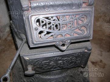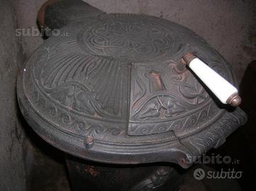 Vendo stufa in ghisa a legna/carbone tipo "Parigina" primi anni del 1900, in buono stato, pulita e restaurata, con base e cappello decorati e fregi in ghisa sul fusto. Dimensioni base cm 43x43, diametro fusto cm 29, diametro cappello cm 42, altezza cm 103, diametro camino cm 10.